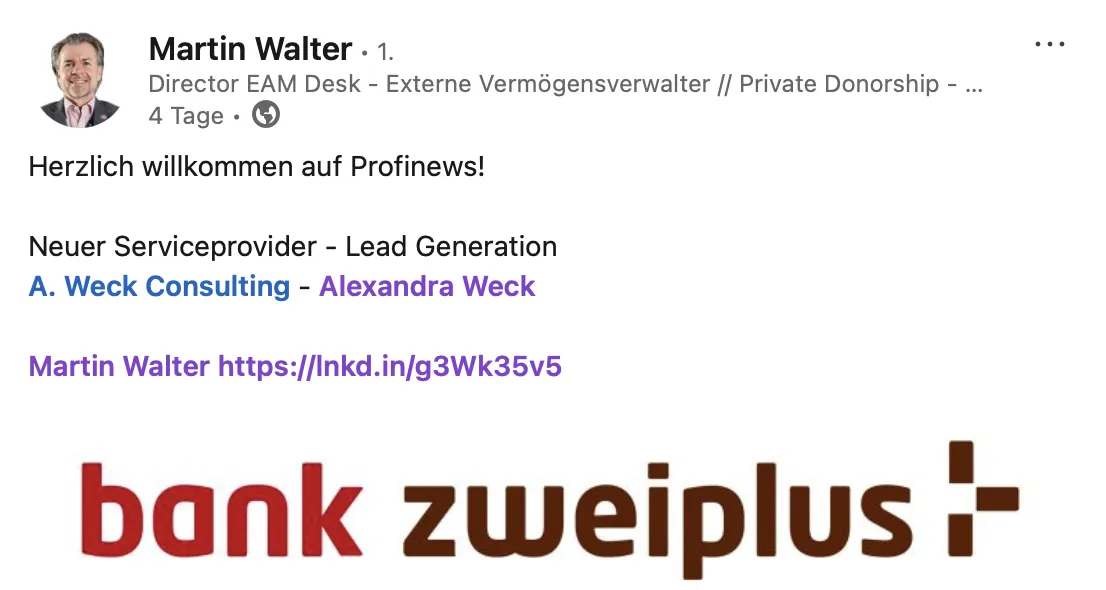 ⭐️⭐️⭐️⭐️⭐️ Alexandra Weck ist nicht nur Sales Expertin, sondern hat auch in der Finanzbranche für ihre Arbeitgeber netto AuM über 500 Mio sowie mehr als 10 Mio wiederkehrende Nettoerträge generiert. Außerdem hat sie als Projektleiterin – als eine der Ersten in Deutschland – diverse Fintechs erfolgreich an Depotbanken und deren Infrastruktur angebunden.